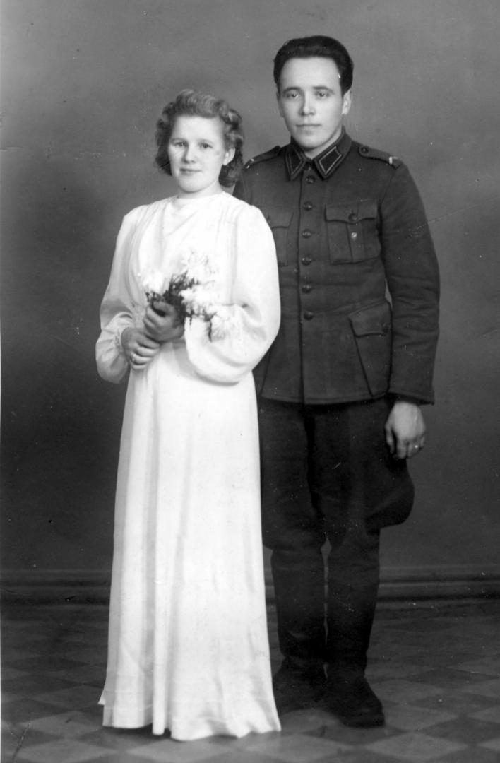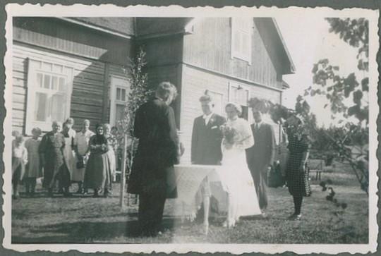 Vilho Koskelainen ja Anja Toivola (1918-2015) vihittiin jatkosodan aikana. Kuvassa tuore pariskunta Vilhon kotitalon seinustalla. Hirrestä rakennettu talo on 1930-luvulla vuorattu panelilla ja maalattu vaaleaksi, talossa jykevä kiviperustus. Kuvan vasemmassa reunassa kajastaa Tervajärvi. Lahtela 1940-luku (Vilma Virkilä)