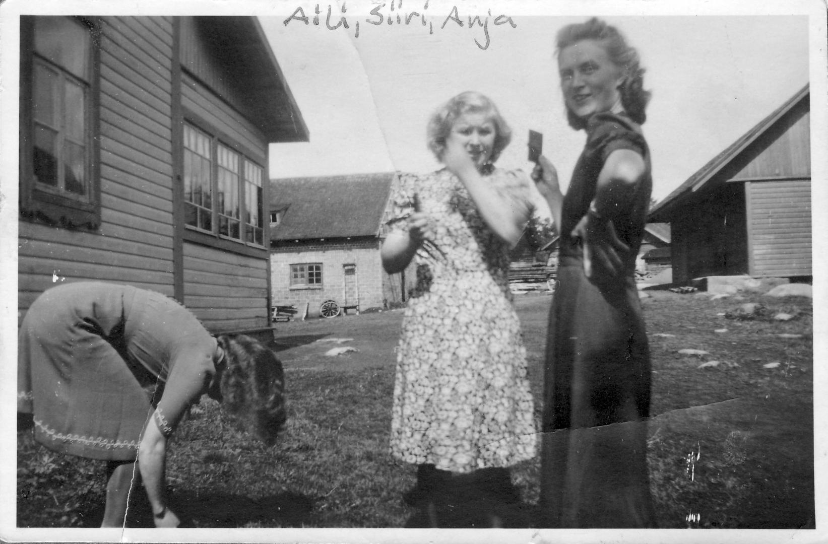 Koskelaisen tyttäret Aili ja Siiri (1921-1993) ja miniä Anja Lahtelan pihassa, tai kartanolla, kuten Karjalassa sanottiin. Lahtela 1940-luku (Vilma Virkilä)