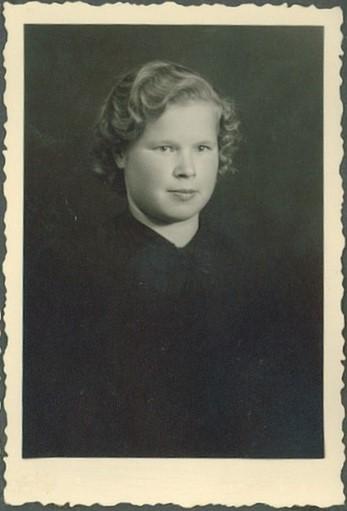 Vilma Koskelainen (1928-2022). Talvisodan evakkoon lähdettäessä Vilma oli 12 v. Isä oli kuollut edellisenä vuonna, aikuinen veli oli sodassa ja Vilmaa nuorempia lapsia olivat Pentti (1931-2008) ja Kauko (1934-2013). Vilmaa vähän vanhempi Eino (1926-1990) 13 v huolehti nuoremman sisarussarjan evakkomatkasta, josta kerrotaan toisessa kuvassa. (Vilma Virkilä)