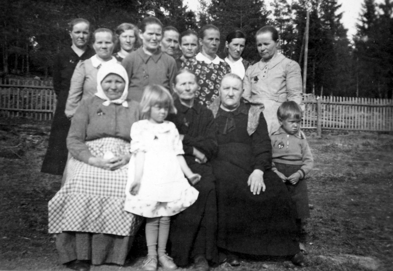 Myllysenpään naiset viettävät äitienpäivää Matti Aspin pihalla 1938. Oikeassa reunassa on Miina Koskelainen Lahtelasta tr53 nuorimman Kauko-poikansa kanssa. Edessä vas Anna Aspi Tattarista, Hikka Nippula Jokelasta, Helena Mälkki Mälkkilästä ja Anna Mälkki Suurpeltolasta. Takana vas. Anttilan Antin vaimo Emma Koskelainen, Helena Myllynen Uutelasta, Harjulan Antonin Toivo-pojan vaimo Vieno Koskelainen (Amalian tytär), Miina Myllynen Kotterista, Amalia Koskelainen Harjulasta, Elvi Aspi Tattarista, Tilda Mälkki Suurpeltolasta, Helmi Mälkki Lahdenpohjasta. Tattari 1938 (Mälkin kuvakokoelma)