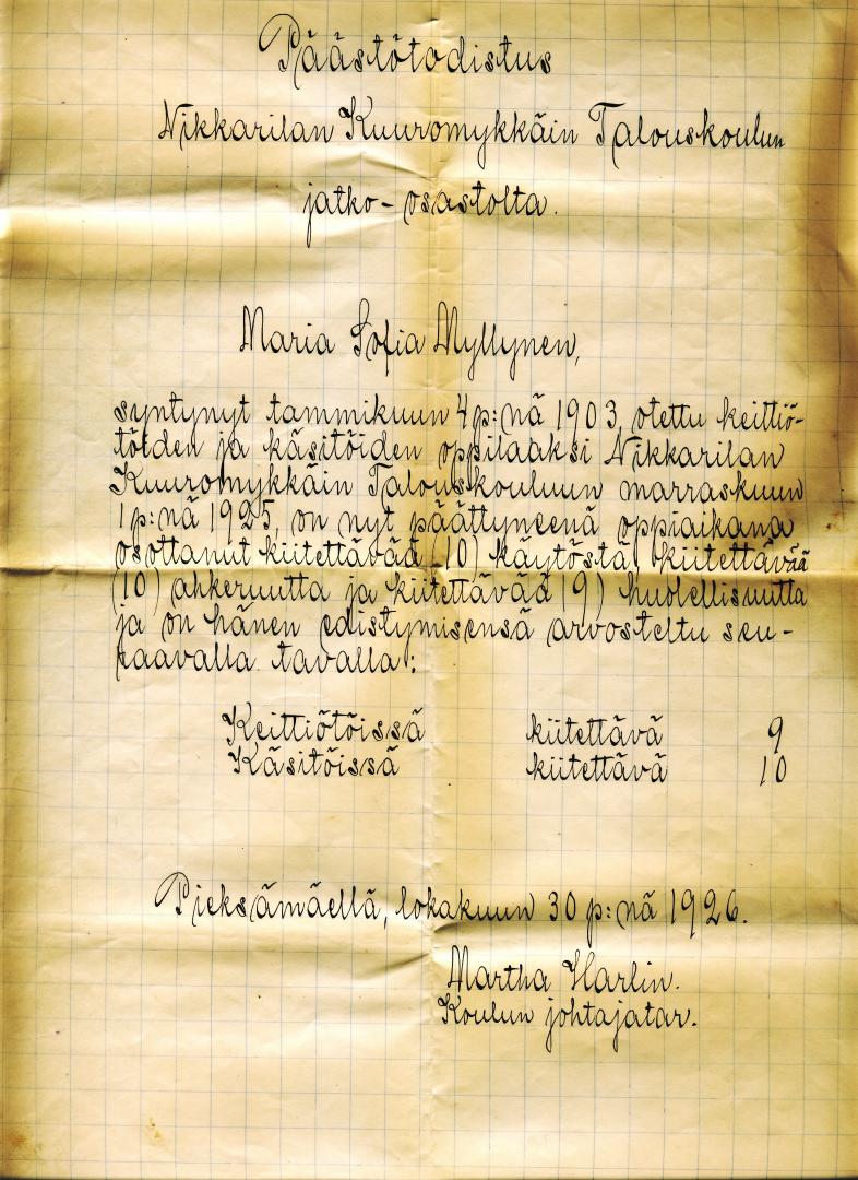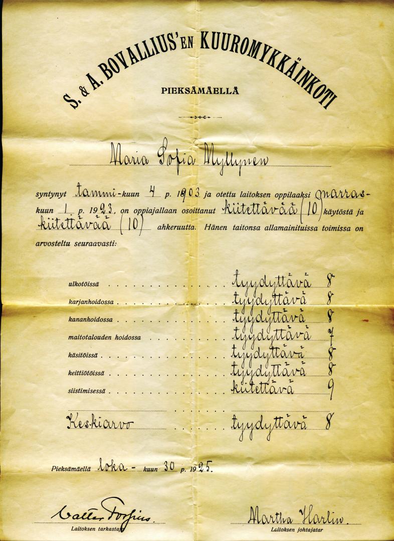 Lydia oli äidin kuollessa juuri täyttänyt 15 vuotta. Ajan tapaan hän heti rippikoulun käytyään lähti apulaiseksi naapurikylään luultavasti niin, että Maria oli hänen mukanaan kunnes lähti kolmen vuoden kuluttua Pieksämäelle jatko-opintoihin. Studiokuva 1920-luku (Eeva-Liisa Jarla)