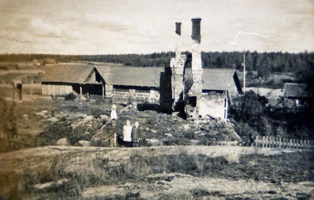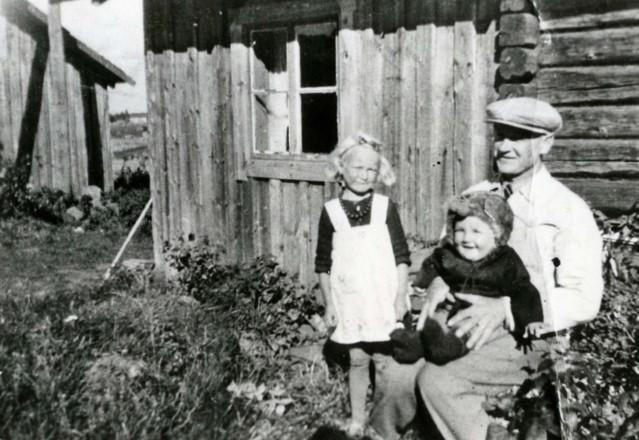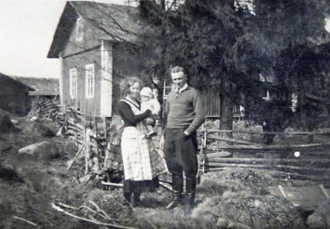 Urho Päkin perhe Säkkijärveltä osti Seppälän tilan vuonna 1934 Mikko ja Tilda Ampujalta. Kuvassa Urho (1906-1983) ja Impi Päkki (1913-1993) sylissään vanhin lapsensa Raija (s. 1936) talonsa luona, joka paloi talvisodassa. Seppälä 1937 (Jorma Päkki)