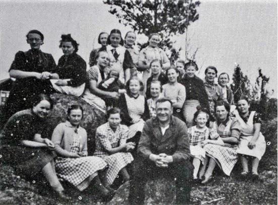 Vanhankylän marttojen kudontakurssi koolla Päkillä, takarivissä kuvan keskellä (2. oikealta) talon emäntä Impi Päkki ja edessä isäntä Urho Päkki. Samana vuonna kudontakursseja pidettiin myös Niemelässä Matti Metson talossa. Seppälä 1938 (Jorma Päkki)
