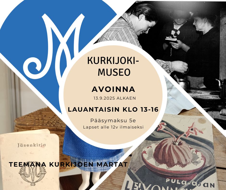 ** MUSEO AVOINNA NORMAALISTI klo 13 - 16. Kurkijoen Martat 120-vuotta näyttely jatkuu. **