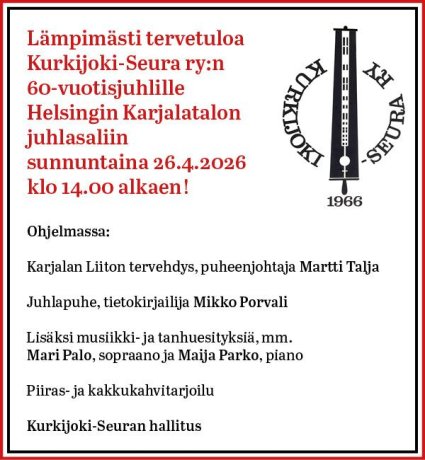 Kurkijoki-Seura juhlii 60-vuotista taivaltaan Helsingissä Karjalatalolla sunnuntaina 26.4.2026 klo 14.00 alkaen.