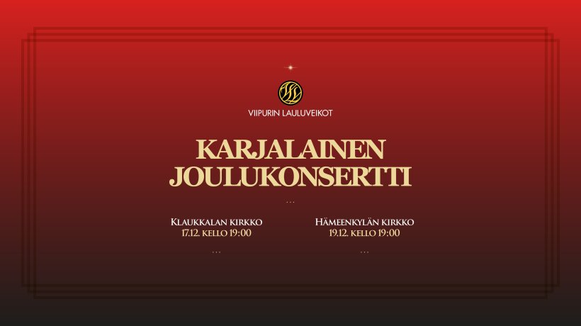 Laulelkame – soitelkame – tehkäme iloinen ilta! Karjalainen joulukonsertti tuo yhteen karjalaiset perinteet ja rakkaimmat joululaulut Viipurin Lauluveikkojen esittämänä.