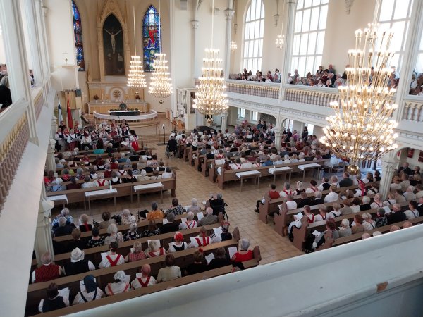 Karjalaisten kesäjuhlien hengelliset tapahtumat vetävät kirkot täyteen. Kuva Mikkelin tuomiokirkossa pidetystä Karjalaisten kesäjuhlien jumalanpalveluksesta vuonna 2024. Kuva: Sofia Flygare.