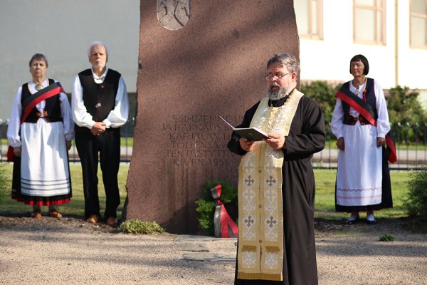 Jumalanpalveluksista siirryimme Karjalaan jääneiden vainajien muistomerkille. Seppeleenlaskun jälkeen oli litania. Litania on ortodoksisessa kirkossa harras rukous, joka toimitetaan edesmenneiden puolesta. Omassa puheenvuorossaan Ismo Haapanen iloitsi ekumeenisuudesta. Eri kirkkokuntien edustajat toimivat yhdessä yhteisen asian eteen. Sodissa kaatuneita sankarivainajia kunnioitettiin laskemalla seppele muistomerkille. Suonenjoella sodissa kaatuneita on 382 henkilöä, joka suhteutettuna vuoden 1939 väkilukuun merkitsee 4,58 prosenttia silloisen Suonenjoen koko väestöstä. Sää suosi juhlintaa ja muistomerkeillä käyntiä – aurinko paistoi ja lämpötila ylsi reilusti yli 20 asteeseen.