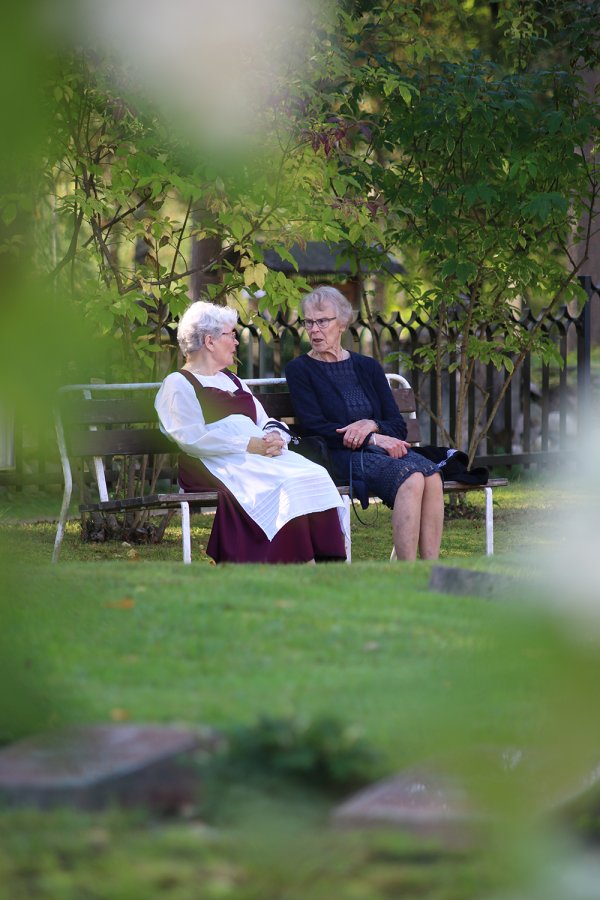 Kuulumisten vaihtoa kirkkopuistossa. Kuva: Riikka Venäläinen