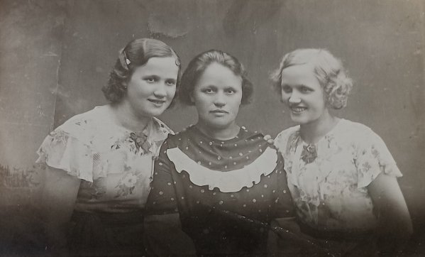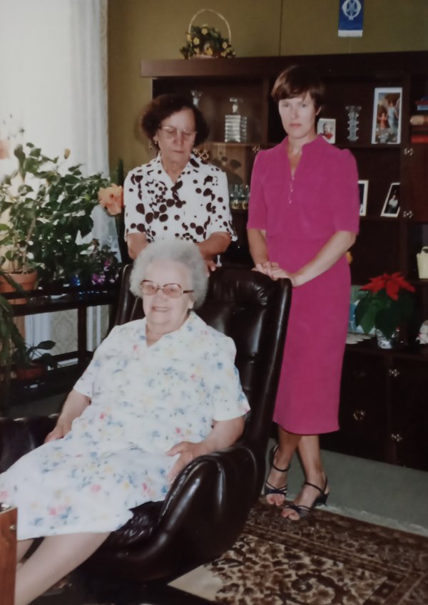 Aino Paloposki (istumassa), tytär Sylvi Nikkanen ja tyttärentytär Ritva Vesalainen 1970-luvulla. Kuva: perheen kotialbumi.
